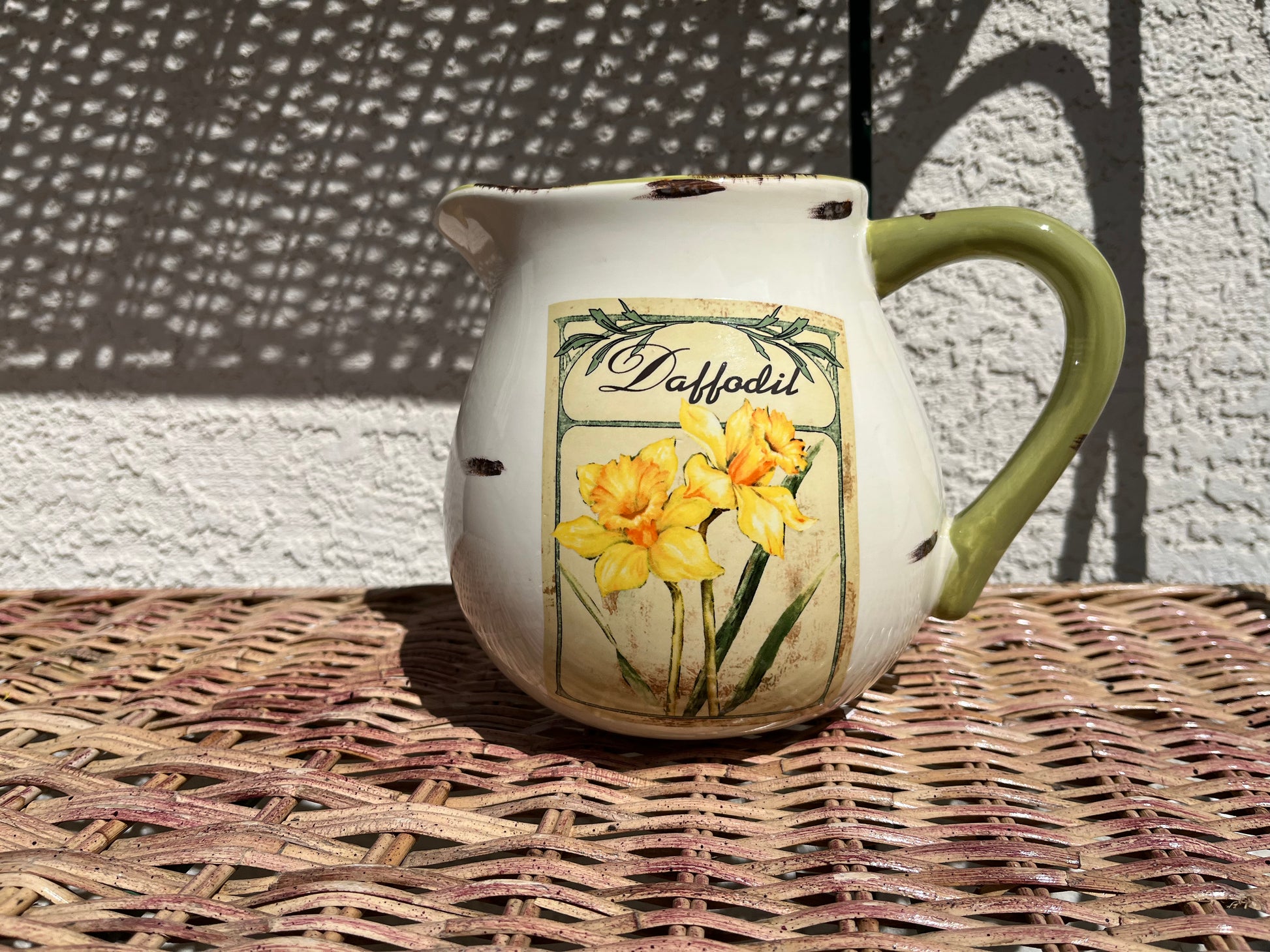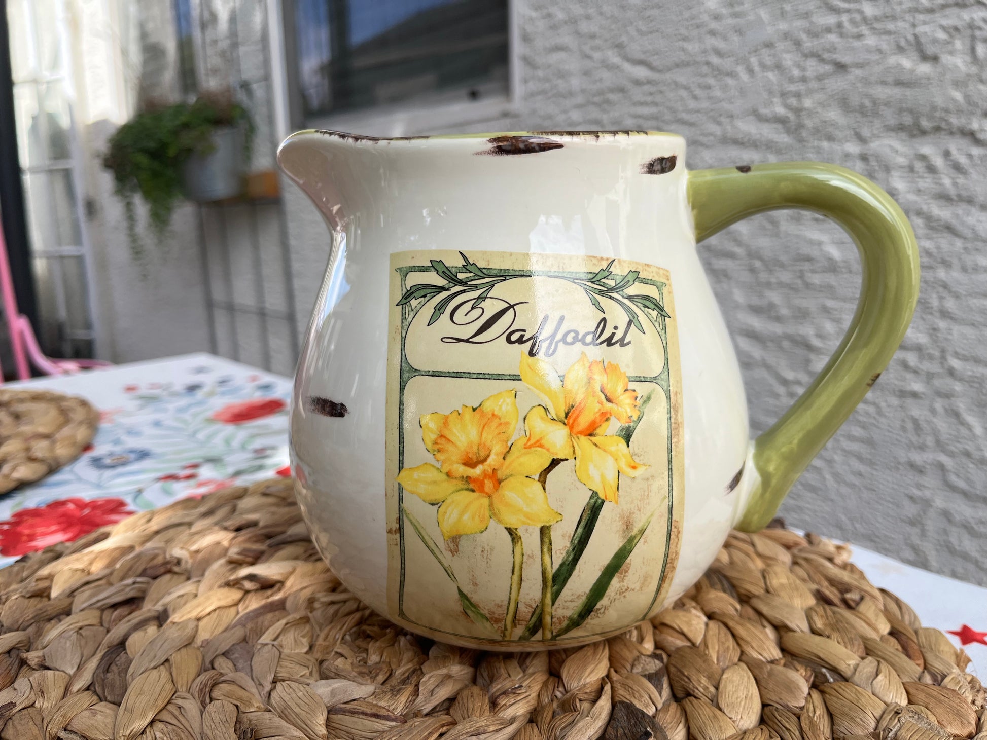 Add a touch of sunshine to your kitchen with our beautiful hand-painted Daffodil Pitcher from the Forget Me Not Collection. This timeless ceramic piece features delicate daffodils, symbolizing renewal and fresh beginnings—perfect for bringing the bright warmth of spring to your home all year long.