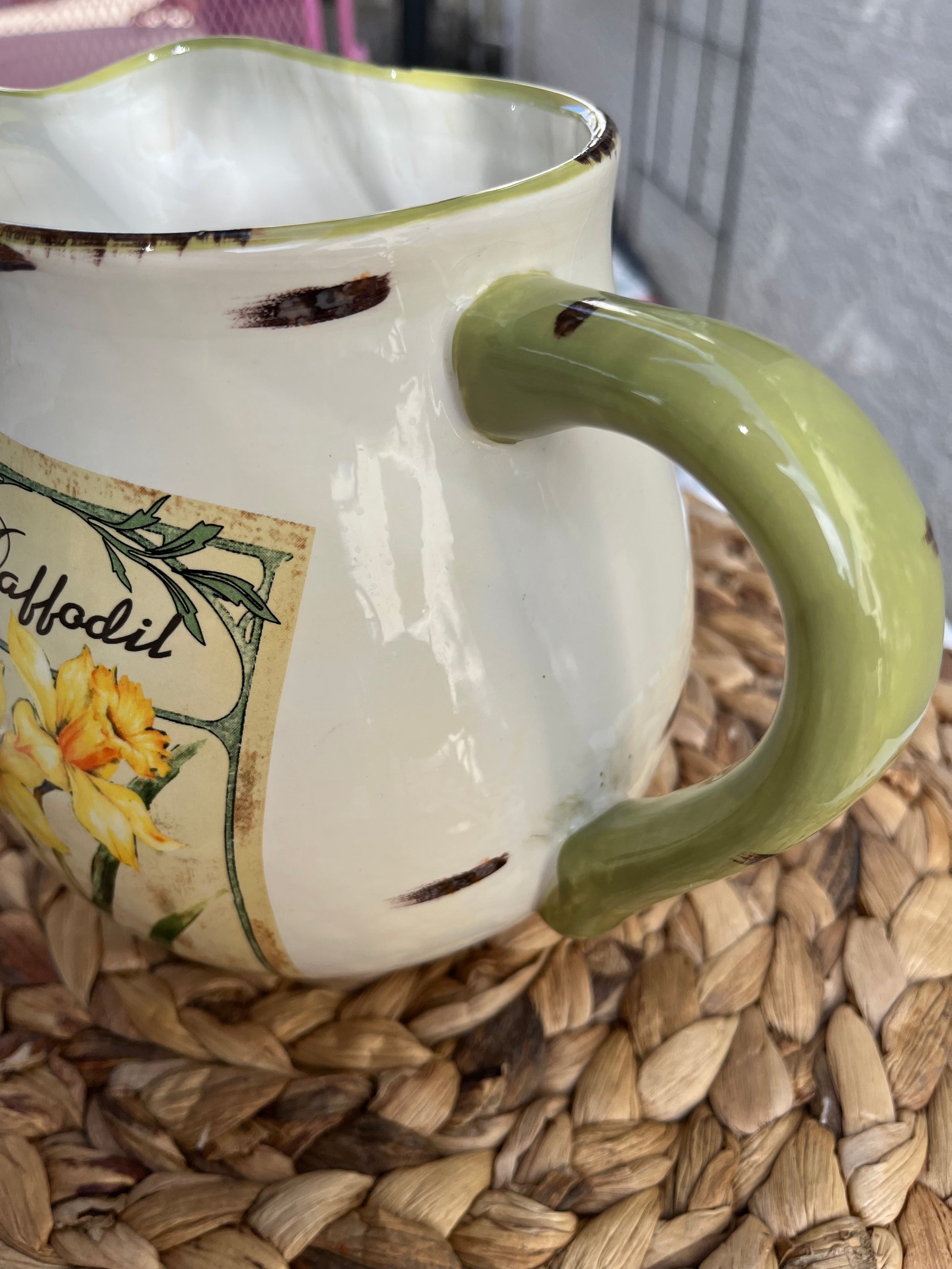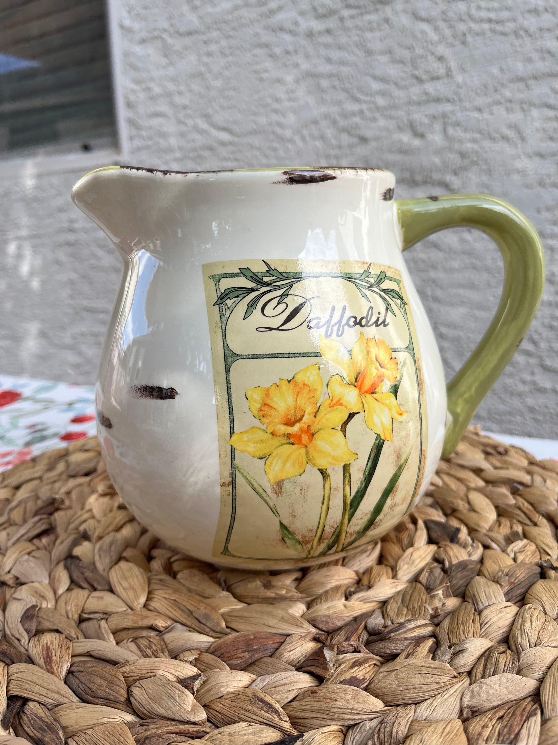 Rustic Daffodil Pitcher - Cream with Sage Green and Brown Accents - Hand-Painted Ceramic Décor
